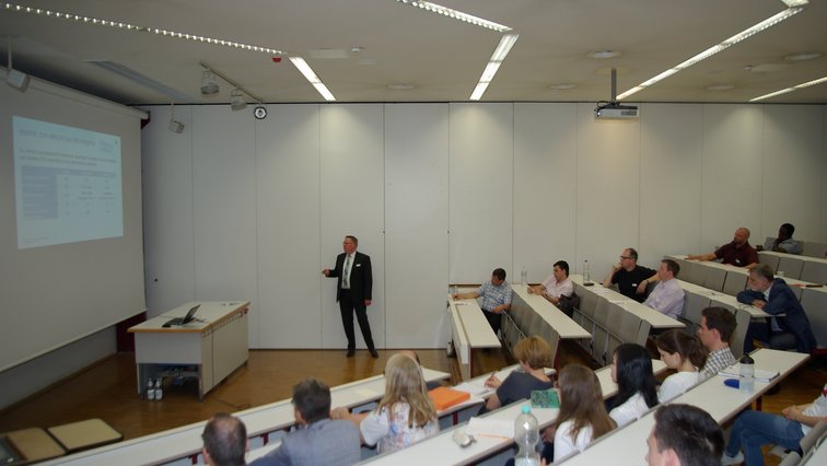 Every two years, the Mathematics Department invites speakers from banks and insurance companies to the HFT Stuttgart for the Finance & Insurance workshop, where they give presentations on their activities. In addition to students specializing in “Finance and Insurance Mathematics,” the workshop always attracts an external audience from banks, insurance companies, and consulting firms in the Stuttgart area to the university.