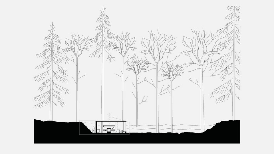 The "Word Studio" offers a writer a temporarily habitable living and working space in a wooded area near the Heslacher waterfalls in the South of Stuttgart. Symmetrically arranged wall brackets hold the studio, which is half buried into the ground. These brackets enclose a concentrated space of just under 65 m2. Descending a steep staircase, the studio is entered behind the edge of the building, the utility rooms are located in the rear and play a subordinate role. The room dividing shelving forms narrow corridors which lead to the sleeping area on the right and the reading room on the left. The stove provides warmth and a feeling of well-being. As soon as the narrow corridor is left, wider, almost floor-to-ceiling windows open up views of the woods and the rise opposite. In the centre of the studio is the study, which encourages concentration due to converging boundary wall panels and creativity due to views of the greenery. Sliding doors to the sleeping and reading areas allow flexible feelings of space during the writing process.