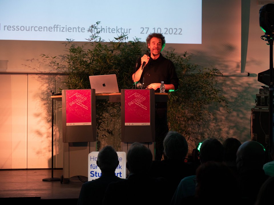 The fact that this future in the urban context is not always in the best of shape is underscored by the challenges facing cities, their leaders, and architects and urban planners. And they start with sustainable construction and do not end with mobility issues. What is needed are solutions for today and the future. Prof. Katja Rade, Rector of the HFT Stuttgart, put it this way in her opening remarks: "We don't have a problem with knowledge. We have an implementation problem." With a view to the findings and the implementations to be derived from them, the lectures by Prof. Juri Troy, architect, and urban planner Prof. Christina Simon-Philipp focused on building and the city as a space for trying things out. Architect Troy's talk was set against the backdrop of the big question: "Continue building despite climate goals? His clear answer: "Definitely not as before." In his opinion, we need to be more sustainable with our resources. "We are living on credit," Troy says. And he adds, "We have to learn again to make do with what we have." What sounds simple is not necessarily so in practice. In Troy's view, we wait too long to take action. For example, he says, any form of change must be subjected to sustainability. "Buildings and cities need to be part of the solution, not part of the problem," Troy summed up.